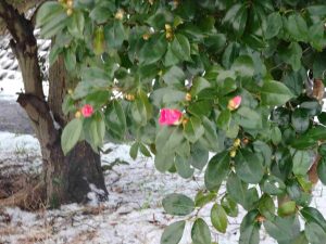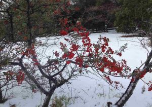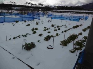 畑も雪をかぶっていて、大根が寒そうに立っていました。