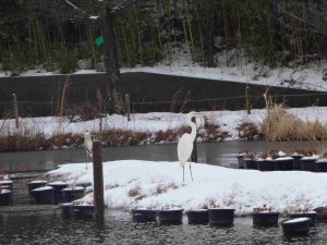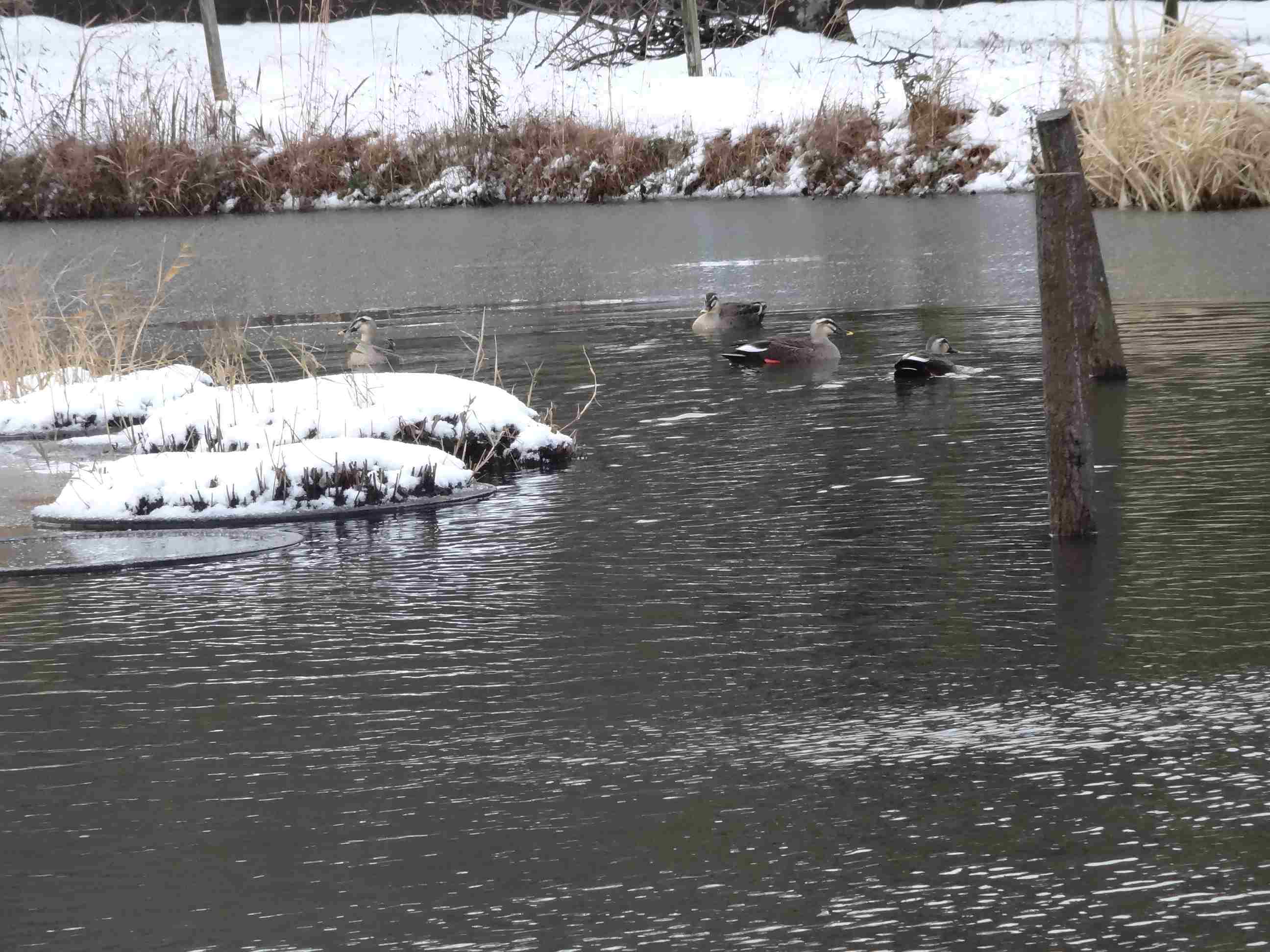 親水池には、カモ、白サギ、青サギなどの鳥たちがくつろいでいました。
